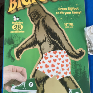 Bigfoot earrings, Bigfoot golf covers, Sasquatch Hot Sauce, replica Skunk Ape plaster footprints, Sasquatch Field Guides, Sasquatch koozies, Bigfoot wood carvings, Bigfoot coasters, Bigfoot bottle openers.